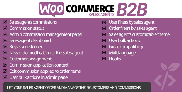 Download Best Seller “WooCommerce B2B Sales Agents” from Codecanyon for category “woocommerce”. Related Tags: b2b, business, commissions, ecommerce, sales agents, sales management, wholesale, woocommerce, wordpress